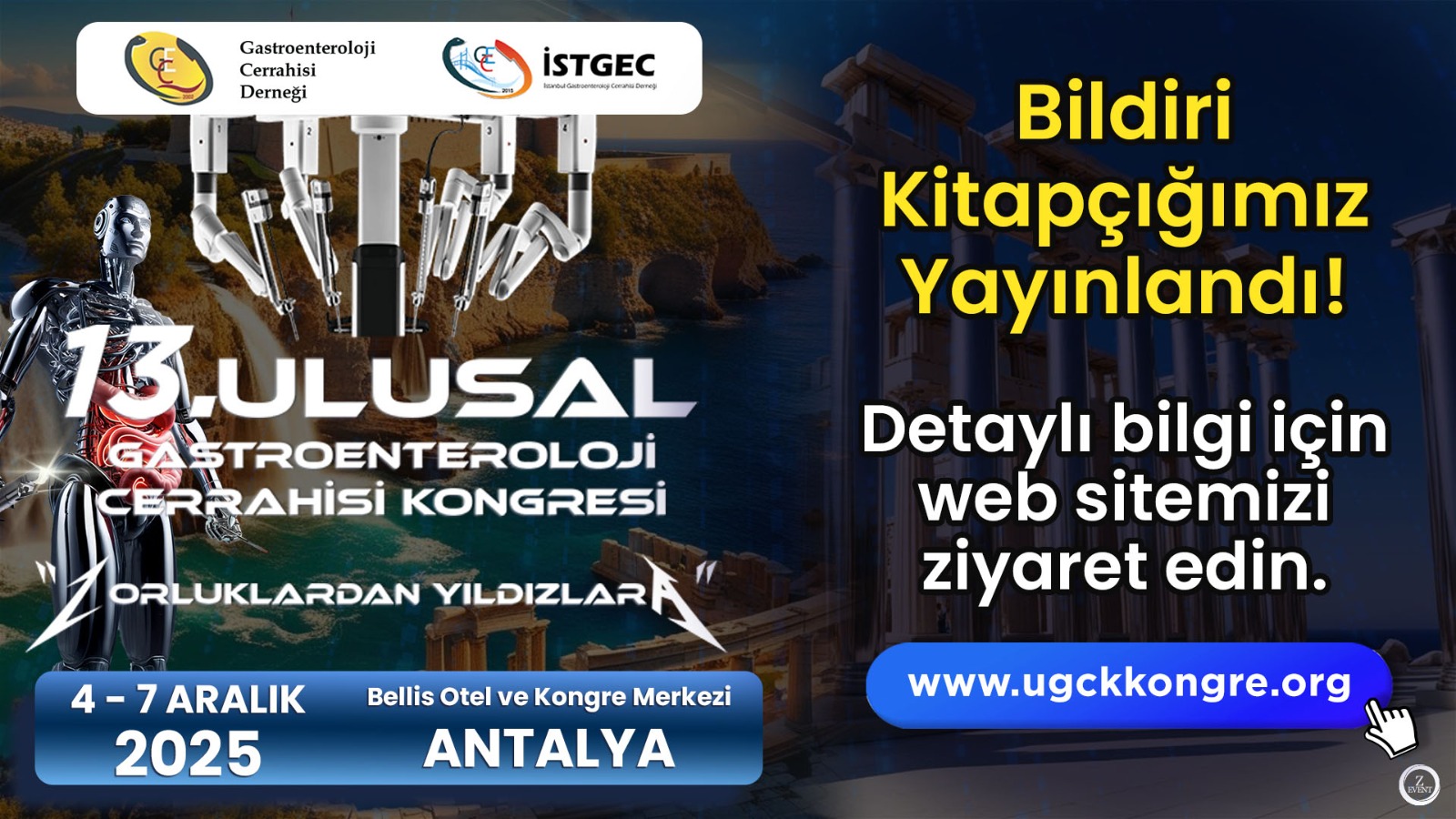 Türk Gastroenteroloji Cerrahisi Derneği olarak, sizleri 4-7 Aralık 2025 tarihleri arasında Antalya Bellis Otel Kongre Merkezinde düzenlenecek olan 13. Ulusal Gastroenteroloji Cerrahisi Kongresine davet etmekten büyük mutluluk duyuyoruz.
